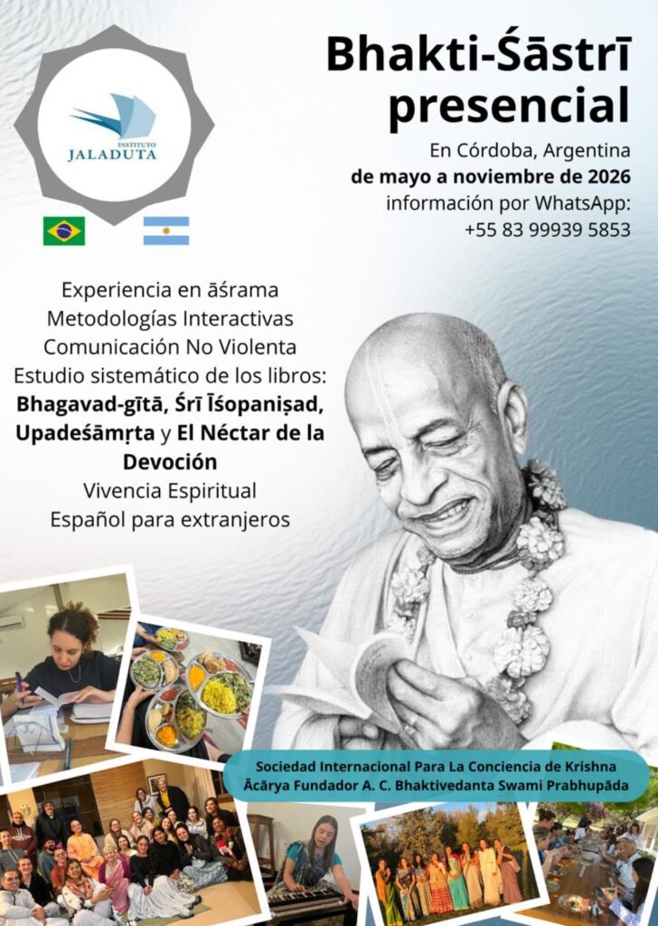 ✨ ¡INSCRIPCIONES ABIERTAS! El curso Bhakti-śāstrī presencial 2026 se llevará a cabo en Córdoba, Argentina, de mayo a noviembre. Una inmersión transformadora de estudio, convivencia con devotos y vida espiritual.