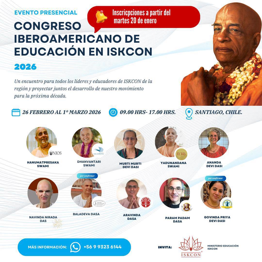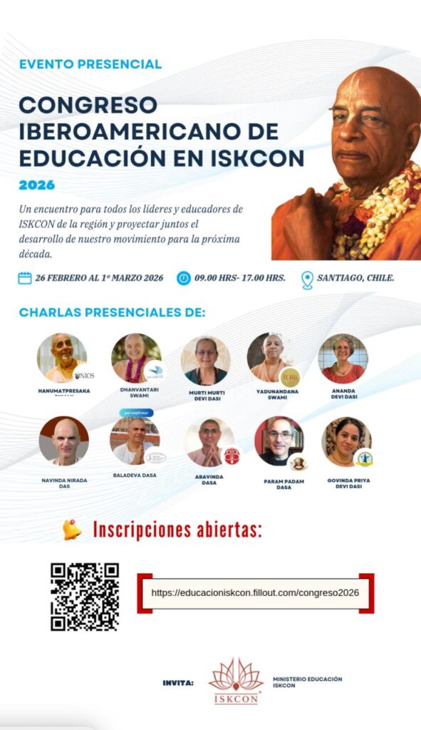 Del 26 de febrero al 1 de marzo de 2026 se llevará a cabo el Congreso Iberoamericano de Educación de ISKCON, en la ciudad de Santiago de Chile. Este importante encuentro reunirá de manera presencial a líderes, educadores y maestros espirituales de toda la región para reflexionar y proyectar el desarrollo del movimiento en la próxima década.